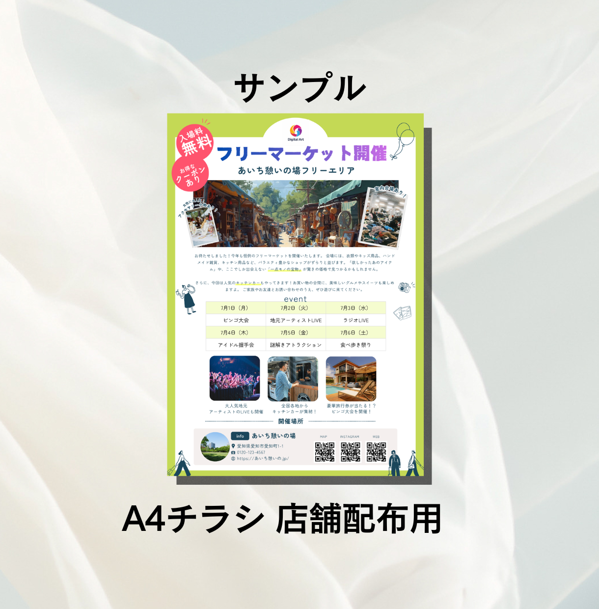 チラシ・POPチラシ制作デザイン制作 A4チラシデザイン A4チラシデザインの制作も対応可能です。 店頭で配布する用のチラシや、POPとしてお使いいただけます。 お気軽にご相談ください。 POP制作 店頭POPデザイン作成